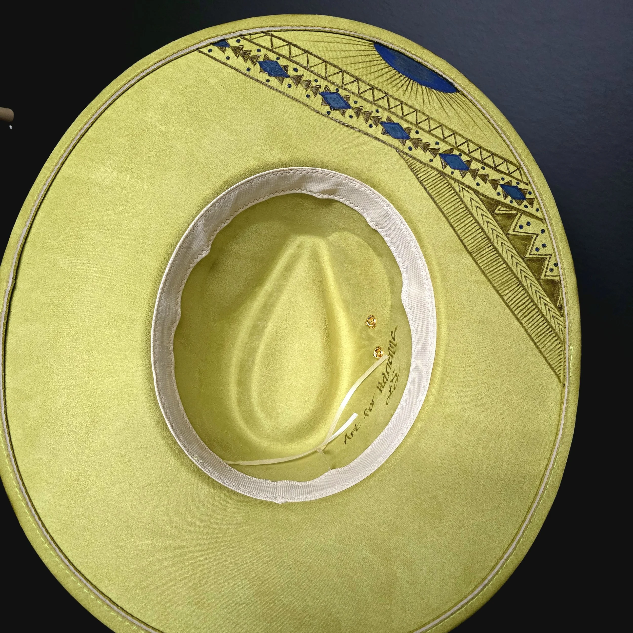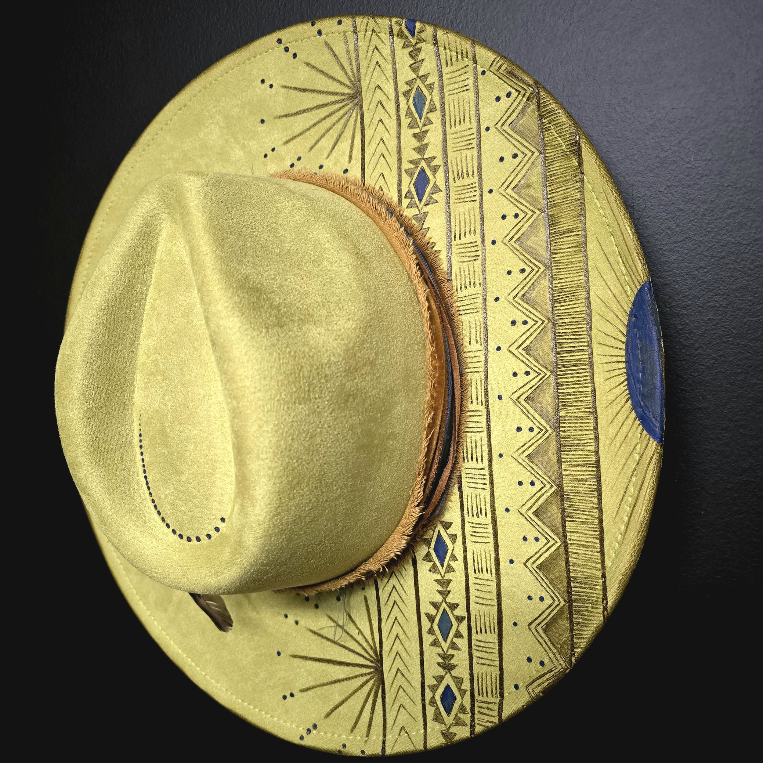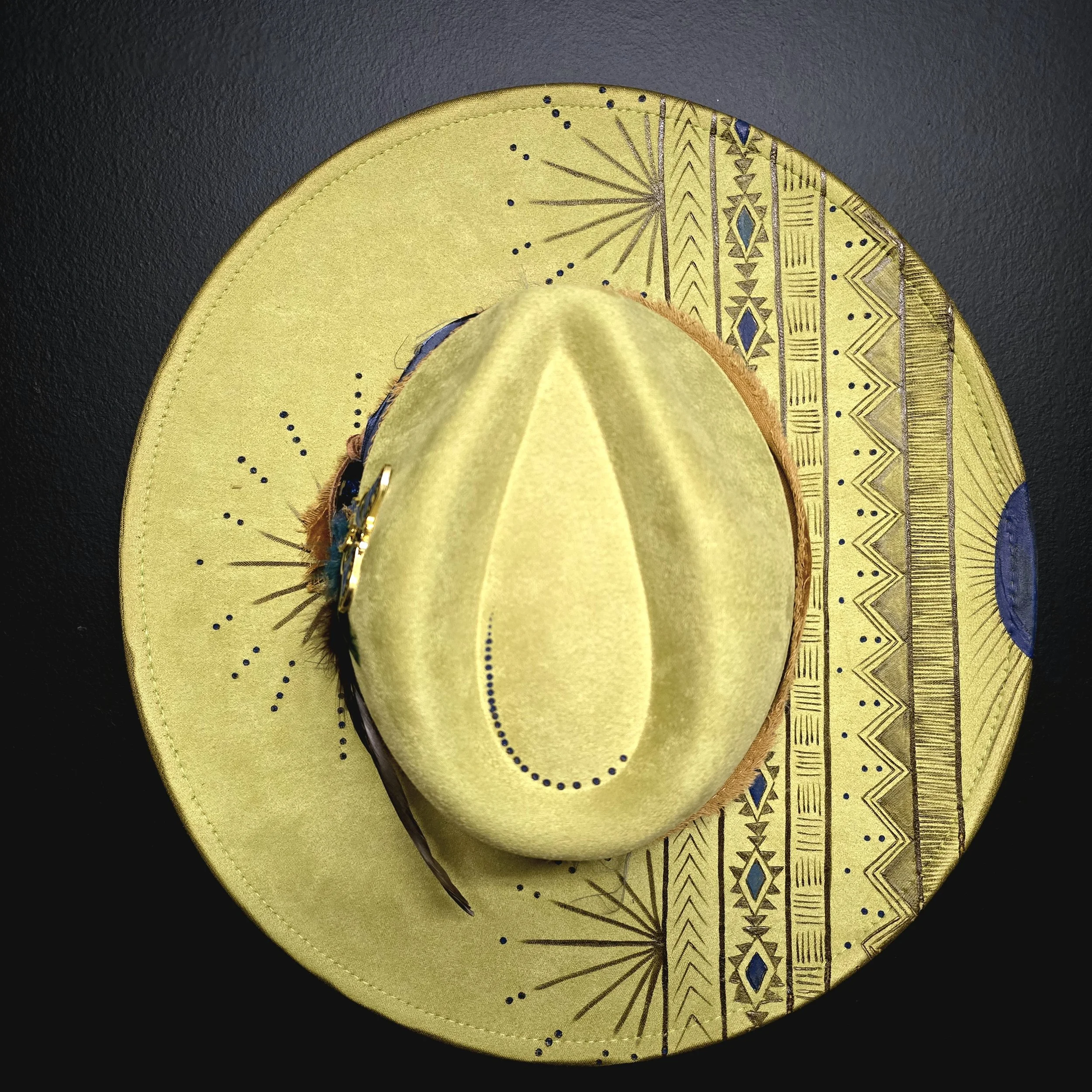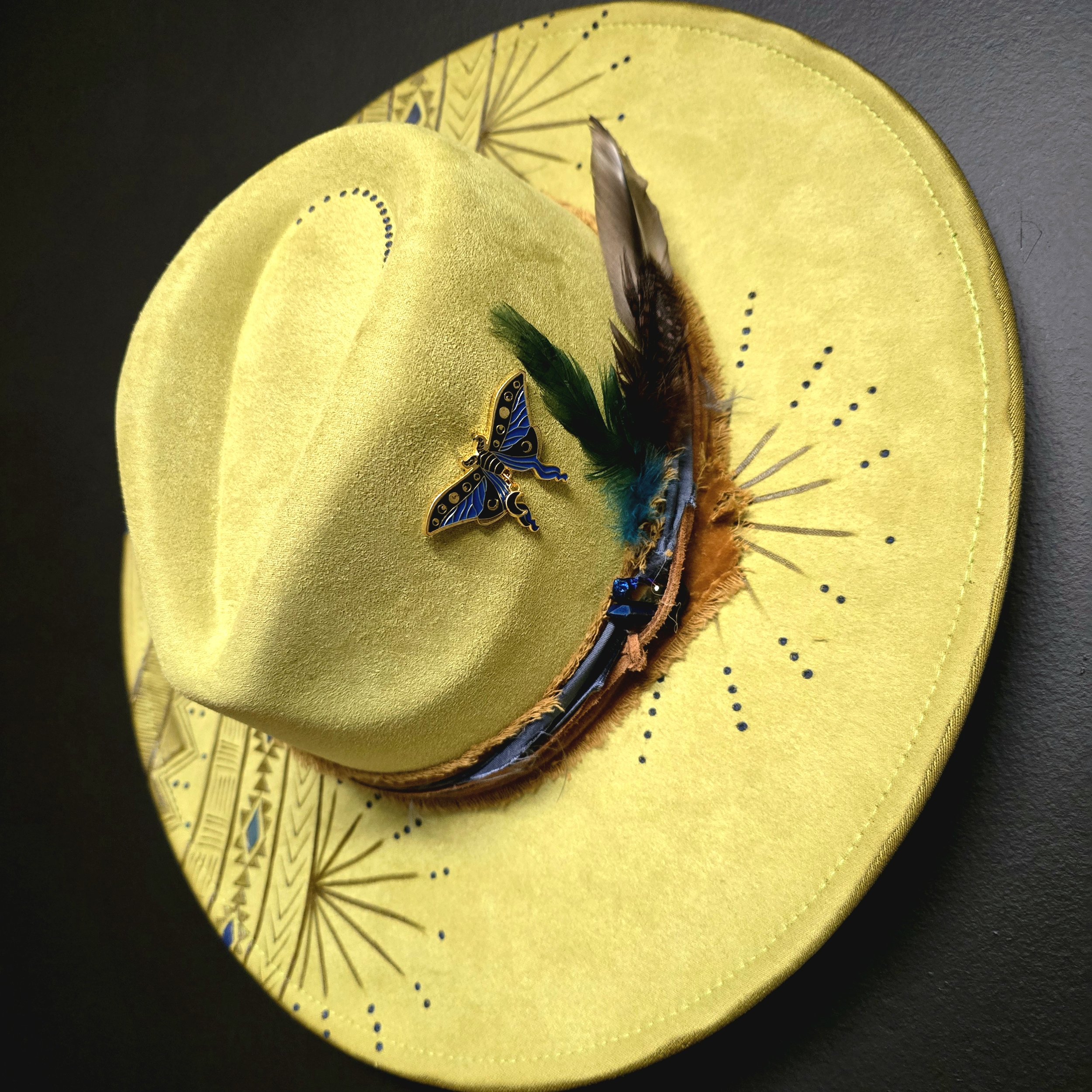 This avocado green vegan suede hat is a showstopper! The color alone will turn heads, but when you get up close and see the crystals, luna moth pin, and intricate design is when the magic happens!